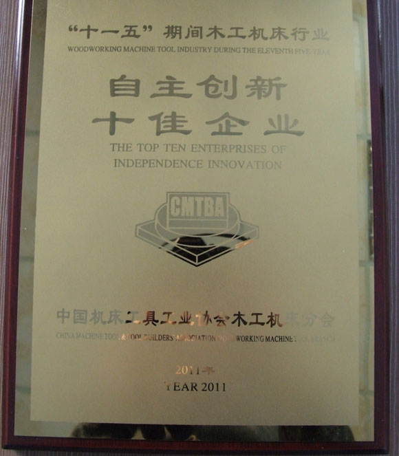 在中國機床工具工業協會木工機床分會的表彰大會上,公司被授予木工機床行業十一五“自主創新十佳企業”稱號,公司董事長董延偉獲得中國木工機床行業“終身成就獎”。
