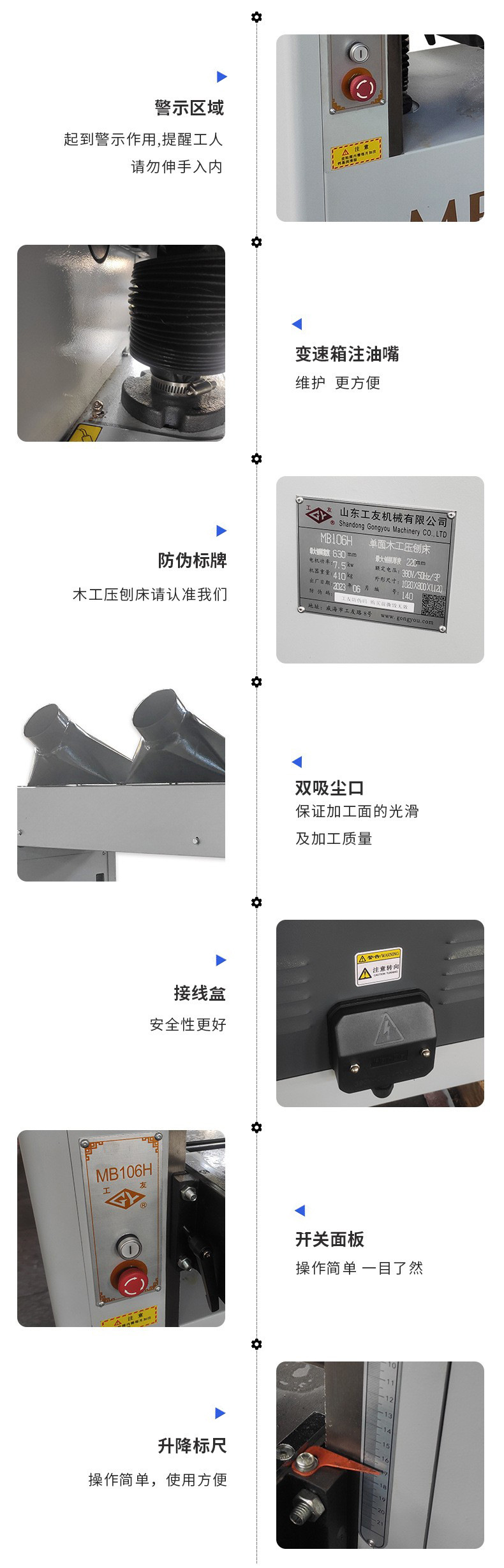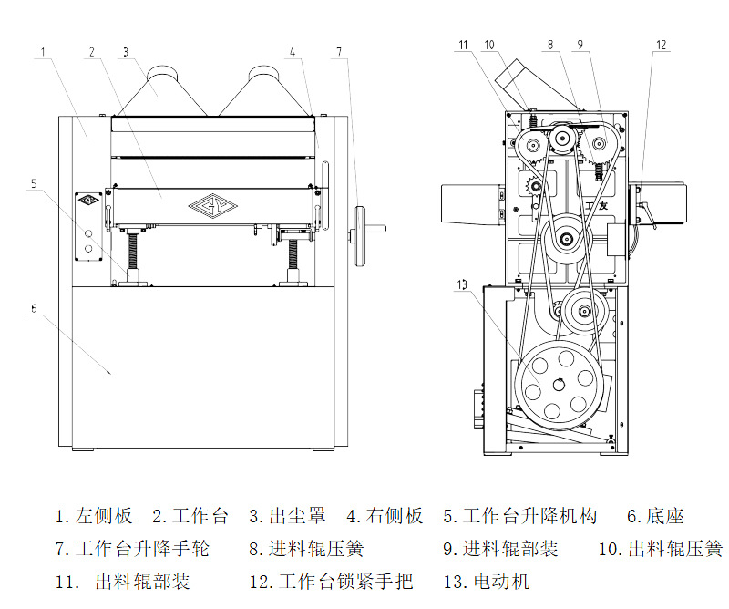 該機床送料平穩,前壓輥采用分段活動結構,可同時送入厚度相差2毫米以內的多塊材料;前后壓料器調節方便,可加工薄板;工作臺升降裝置結構合理,操作平穩輕便;獨特的主軸結構,保證良好的加工質量。該機具有兩級送料速度,可滿足不同加工工件的要求。